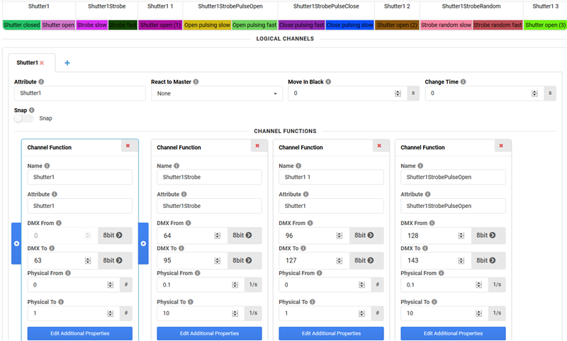 Channel functions are used for bundling specific channel values, for example a strobe function of a shutter channel.