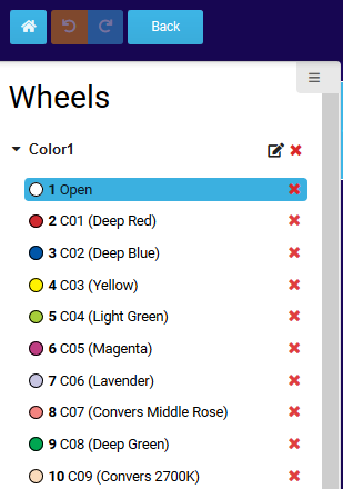 Make sure that the wheel slot in the wheel definition matches the wheel slot number in the channel set. The index is shown between the preview and the wheel slot name.