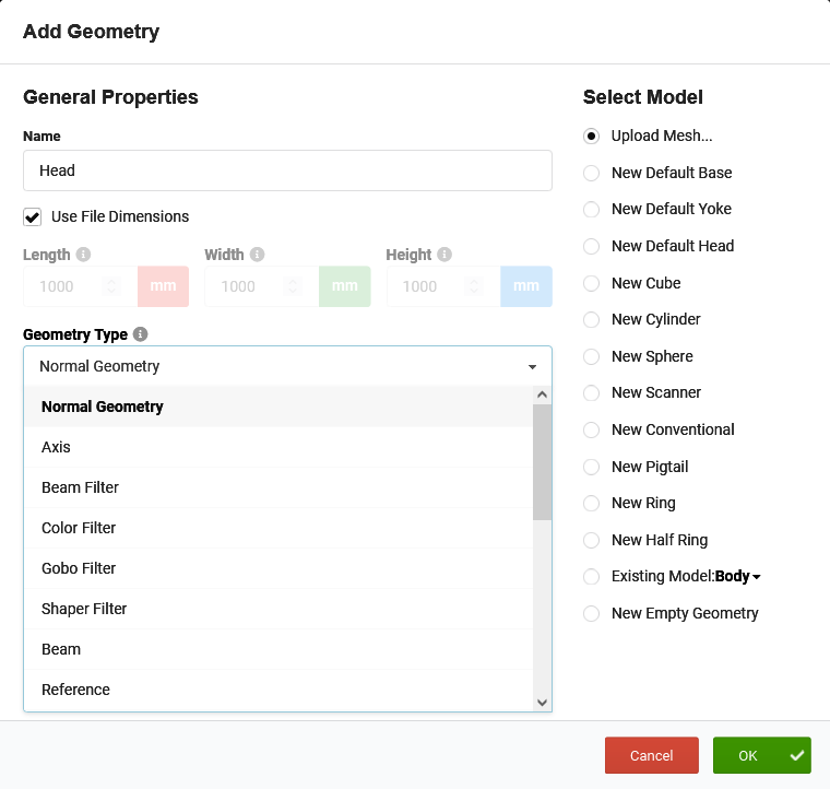 - New Empty Geometry: No 3D model is linked to the geometry.When clicking OK, a geometry with all the given properties is created.
