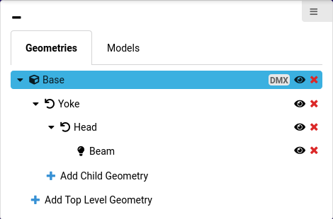 The left part of the Geometry Page shows the Geometries/Models section. In the Geometries section, all geometries are listed in the form of a tree structure. The Models section contains a list of all models that are currently part of the GDTF file.