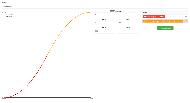 A DMX profile contains one or multiple points. Points contain a mathematical function to describe the relation between DMX input and physical output. To add a new point, click + Add new point. Each point has the following properties: