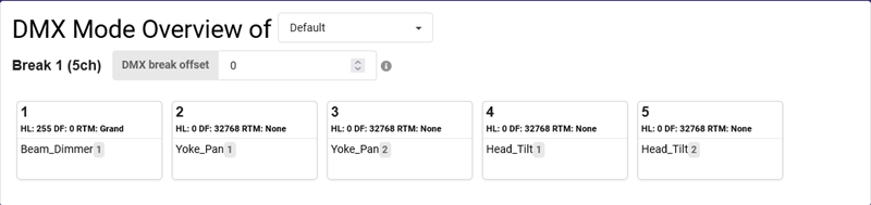 The DMX channels are listed separately for each DMX break. For each DMX channel, additional information is displayed: