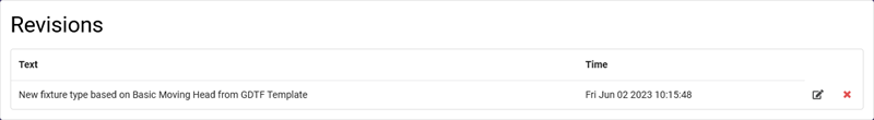 All previous revisions of the fixture type are listed here, showing the revision text and revision time. To edit the revision text, click on the Edit icon (📝). To delete a revision from the revisions list, click on the Delete icon (❌).