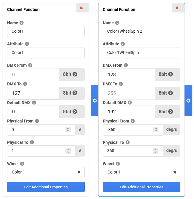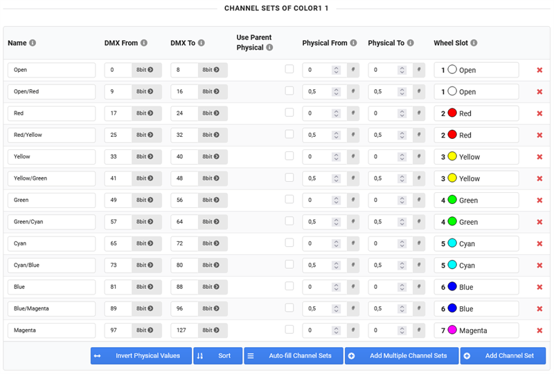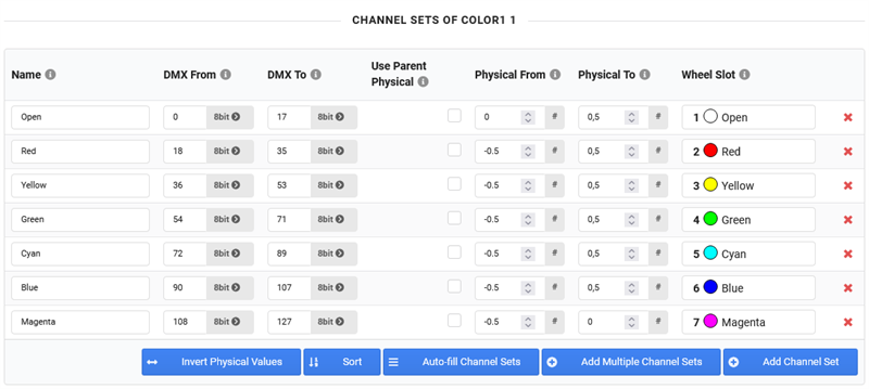 For the split color channel sets, set Physical From and Physical To to: -0.5, if the selected wheel slot should be combined with the previous wheel slot 0.5, if the selected wheel slot should be combined with the next wheel slot.
