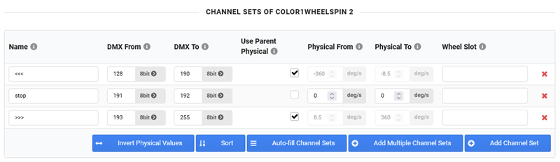 Adjust the DMX From and DMX To values to your needs. If the boxes in the Use Parent Physical column are ticked, the physical values for the channel sets are automatically calculated from the physical values of the channel function - double-check them for plausibility and manually adjust them if needed. The Wheel Slot column will not be used in this case.