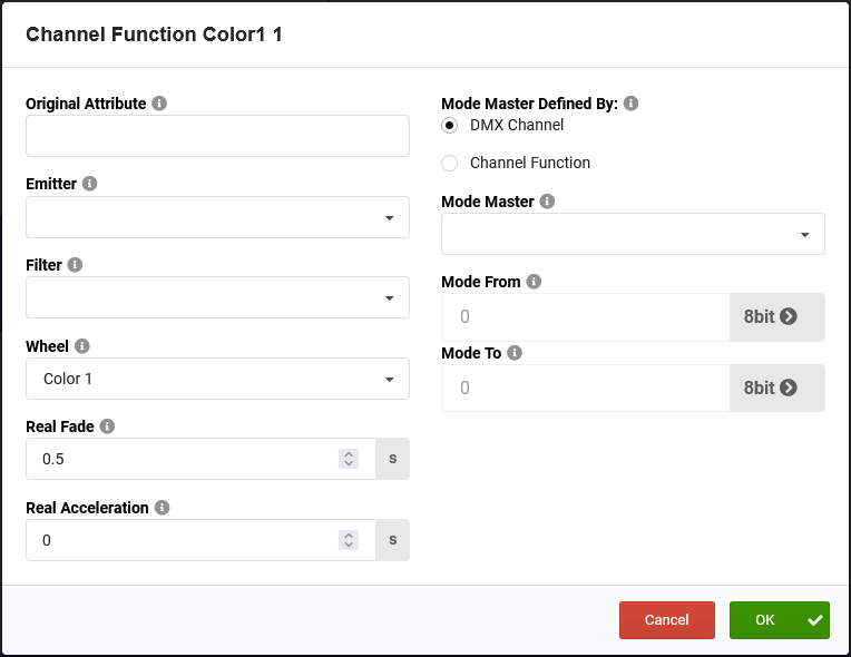 Real color wheels can’t snap in no time between any wheel slots, but instead will more or less quickly run through the slots in between. To describe this behavior, you can give a Real Fade value. Click on Edit Additional Properties at the bottom of your Channel Function and set Real Fade for example to 0.5 seconds. Confirm with OK.