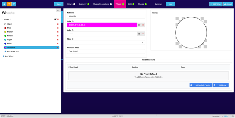 The structure of GDTF allows you to create any combination of wheel type in any slot. However, we will focus on single-type wheels here.