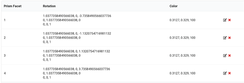 The editor also allows you to visualize multiple facets at the same time and show a circular view, which is useful for checking the final result. Here you can see linear and circular prism represented by the Rotation matrix and also visually: