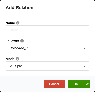 As Follower, select your first additive color channel, for example Beam_ColorAdd_R for the red channel. Leave the Mode at Multiply, as we want to multiply the Dimmer value with the Color value. If you don’t enter a Name, it will be automatically generated. Confirm by clicking OK.