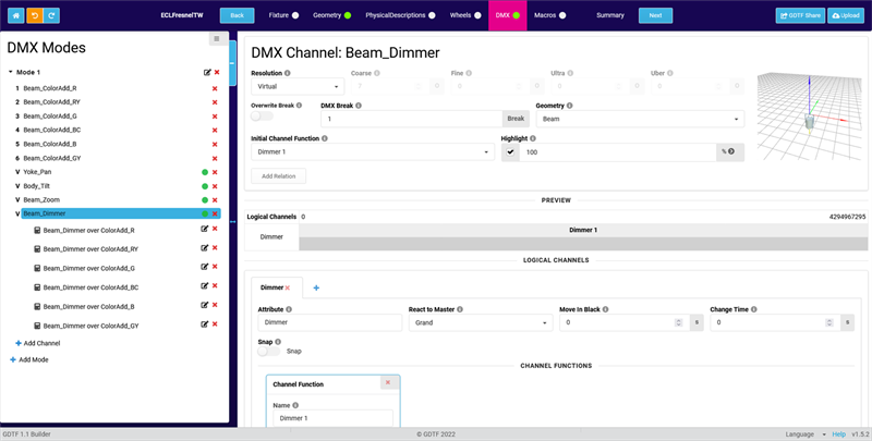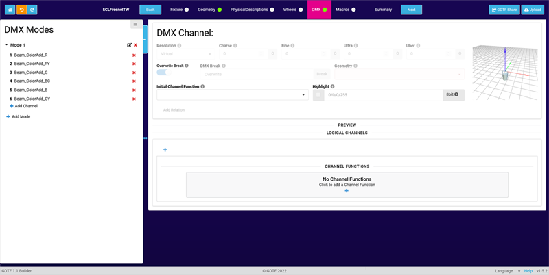 Assuming that you have already created a DMX mode with additive color channels, we will now add virtual Pan/Tilt, Zoom and Dimmer channels.