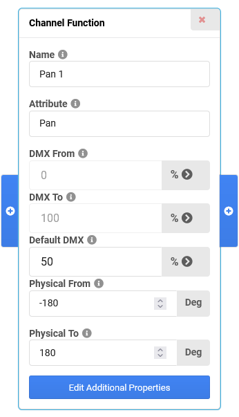 In the Channel Function of the Pan channel, set the Physical From and Physical To values as needed, for example From -180 Deg, To 180 Deg. Adjust the Default DMX value (as percentage of the physical range) to the value which corresponds to Physical 0 Deg, in this case 50%.