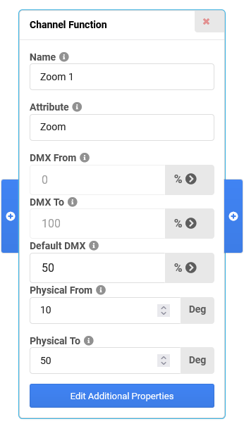 In the Channel Function of the Zoom channel, set the Physical From and Physical To values as needed, for example From 10 Deg, To 50 Deg. Adjust the Default DMX value to a common value, for example 50% (equals 30 Deg physical in this case).
